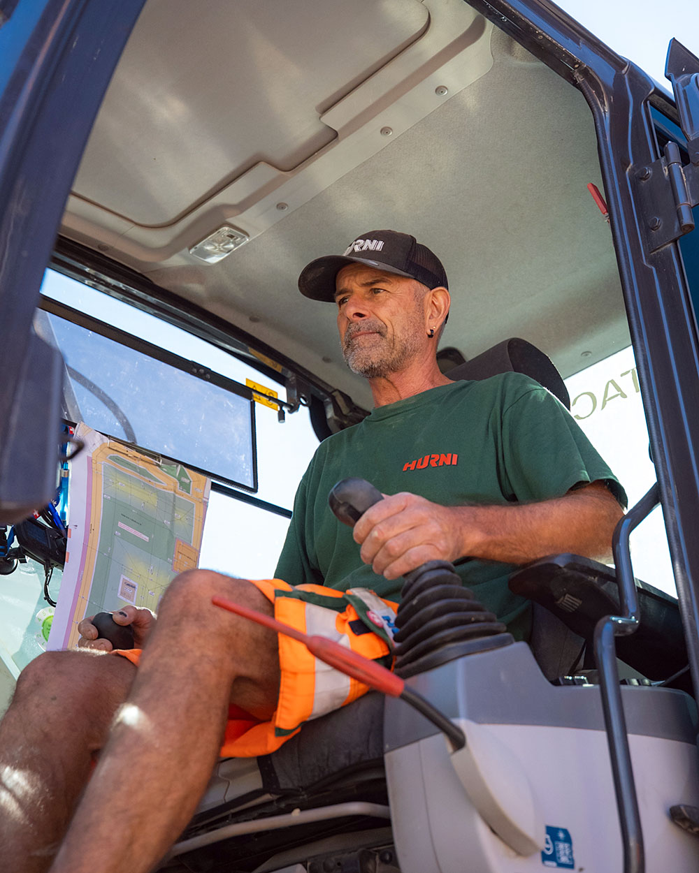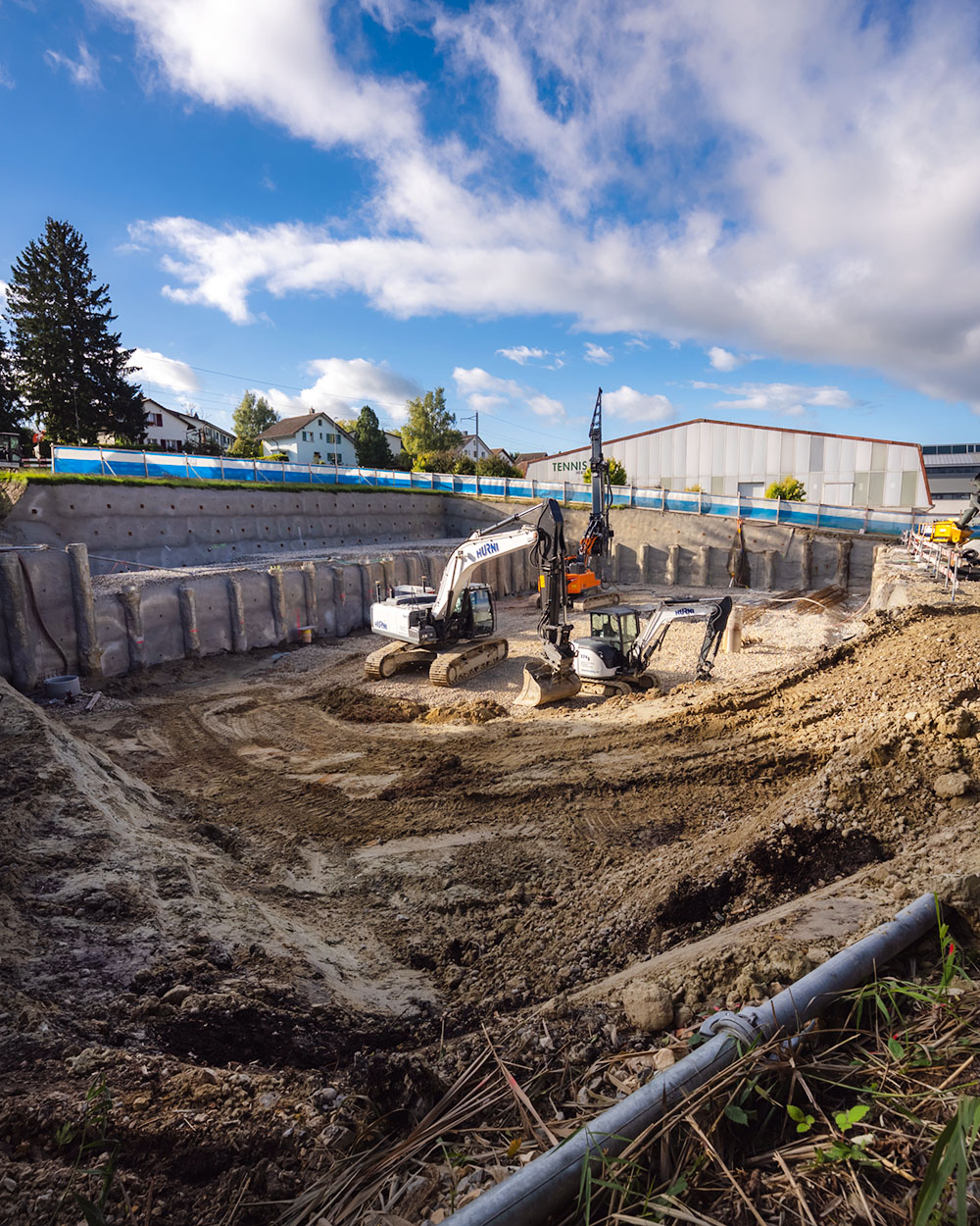 Für den Bau eines Industriebauwerks wurde im Grundwasser eine aufwändige Baugrube erstellt. Nach dem Abtragen der obersten Erdschicht wurden grosse Mengen Material ausgehoben und abtransportiert. Mehrere hundert Lastwagenfahrten waren nötig. Zusätzlich wurden ca. 1’200 m³ Kies eingebracht und der nicht tragfähige Untergrund durch spezielles Steinmaterial ersetzt. Die Baugrube umfasst etwa 1’600 m².