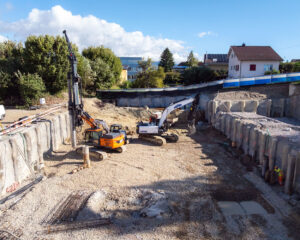 Die Sicherung der Baugrube erfolgt durch eine aufgelöste Bohrpfahlwand, die sowohl die Stabilität als auch die Betriebssicherheit während der Bauphase sicherstellt.